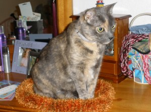 Now, at the age of 14, she could easily be mistaken for a stuffed animal since she rarely leaves my bed. She moves from her pillow, to her blanket, to her windowseat vantage point and back again. Her body is getting the skinny look that comes with age, and she has arthritis. She has her moments of attitude when she smacks me firmly with her paw if I stop petting her. Dingo still manages to keep the younger cats and the dog in line with a simple squint of her eyes. Everyone in the household treats her with the respect she deserves. I have made it clear that Dingo is going to be the first cat to live forever.