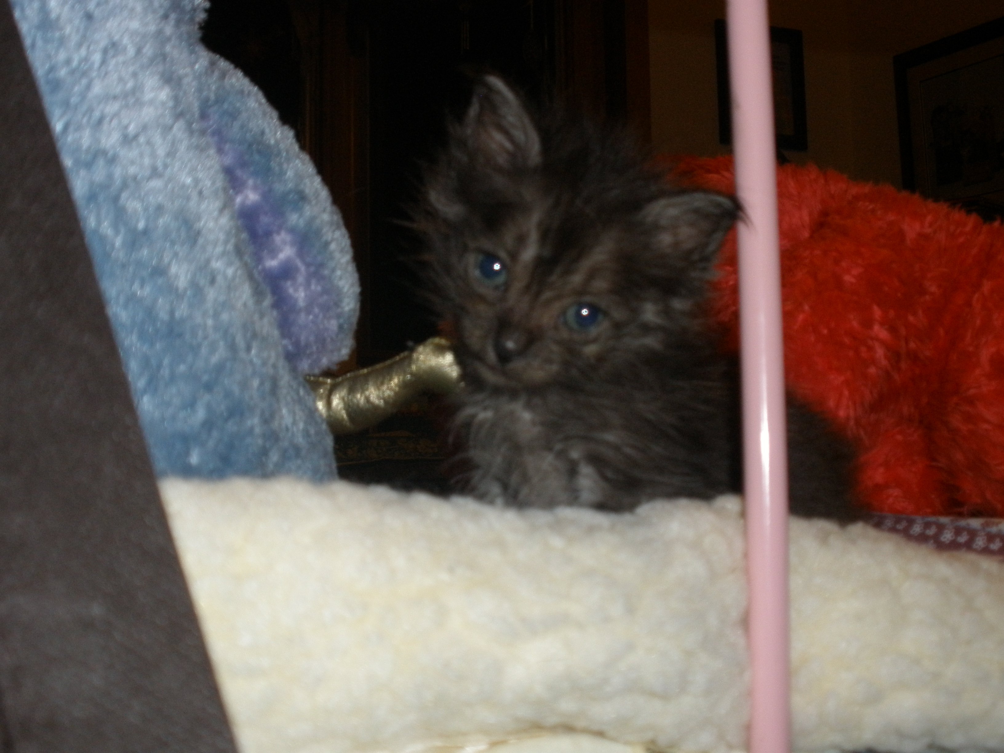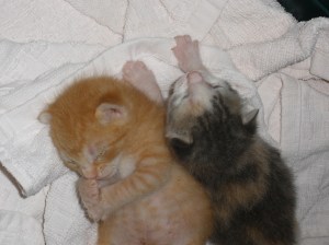“Brooke” is the little calico and she quickly gets drunk on her bottle. When she’s not tipsy from a full belly she’s usually gazing at her world in wide-eyed wonder or voicing her disapproval during clean-up time. “Firestar,” on the other hand, is much quieter and prefers to explore his world for cozy blankets, warm laps, or comforting arms to snuggle in.