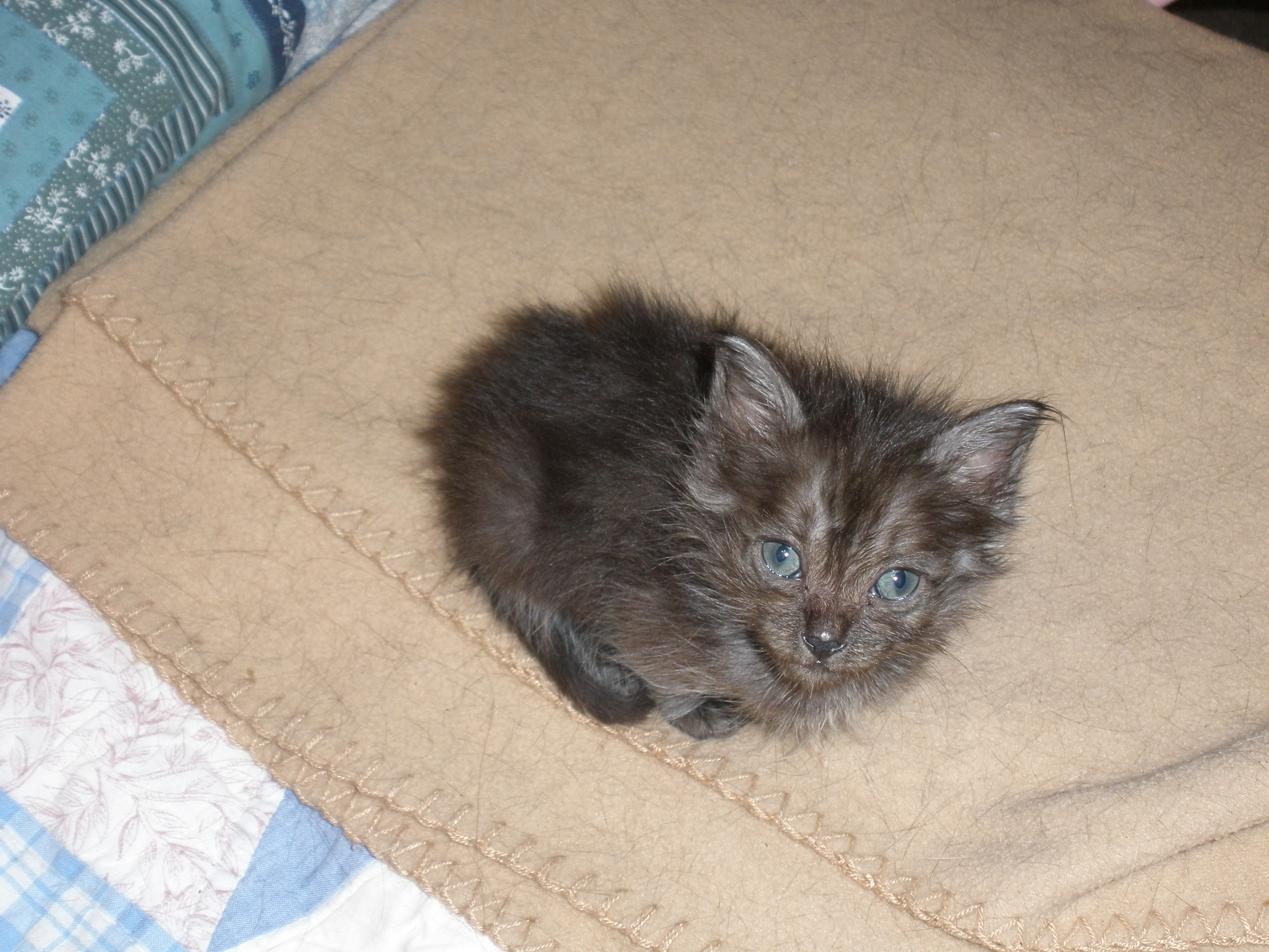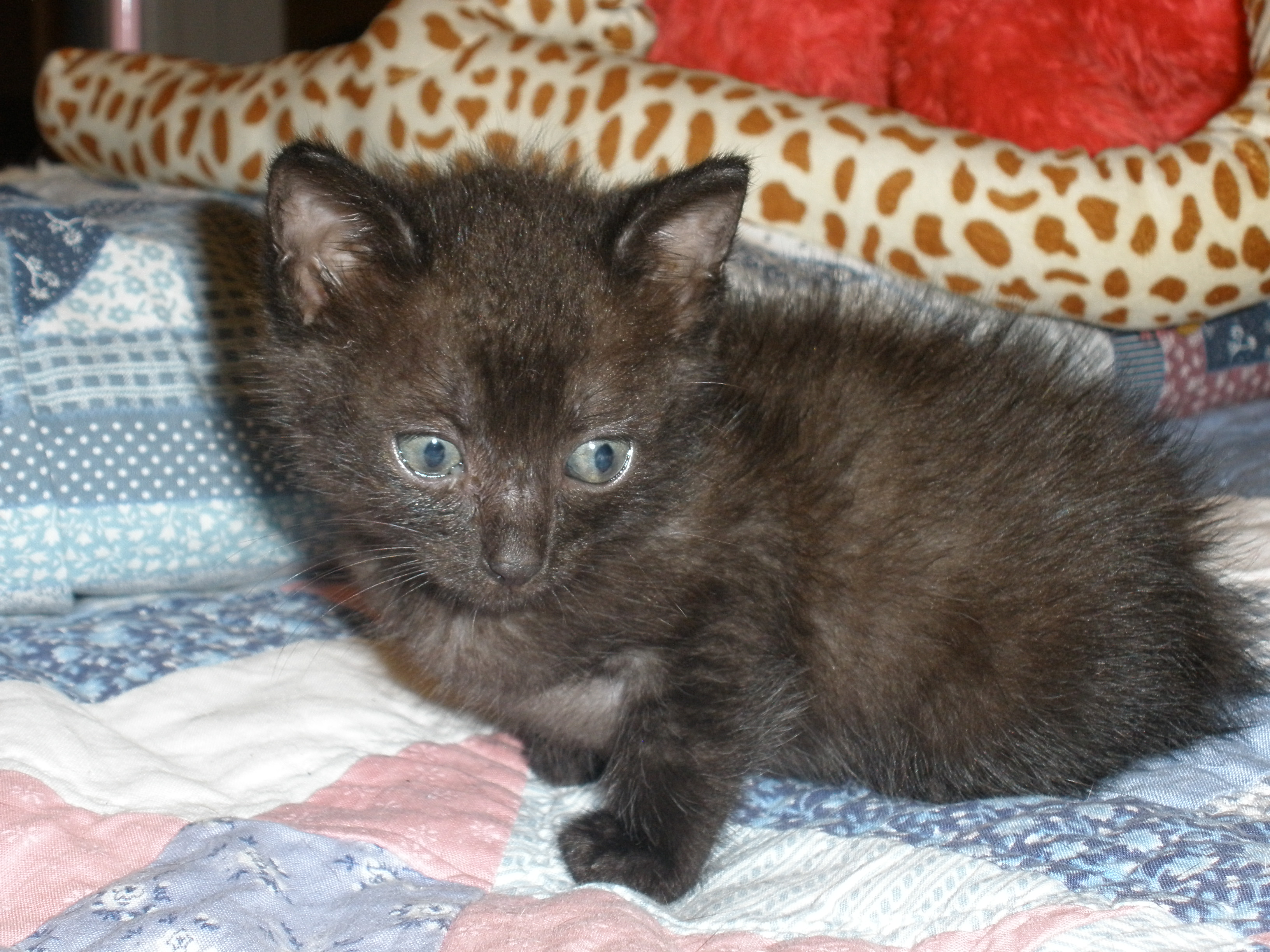 Less than a week later the fifth life showed up on the clinic doorstep as well. “Bear” was born to save the world. The way he struts around the house, with his kinked tail proudly displayed for all the world to see, I can just see his red Superman cape billowing out behind him. He’s a tough guy with a baby’s heart. He really needs cuddling in between his times of exploring, wrestling, and staring down the dog.