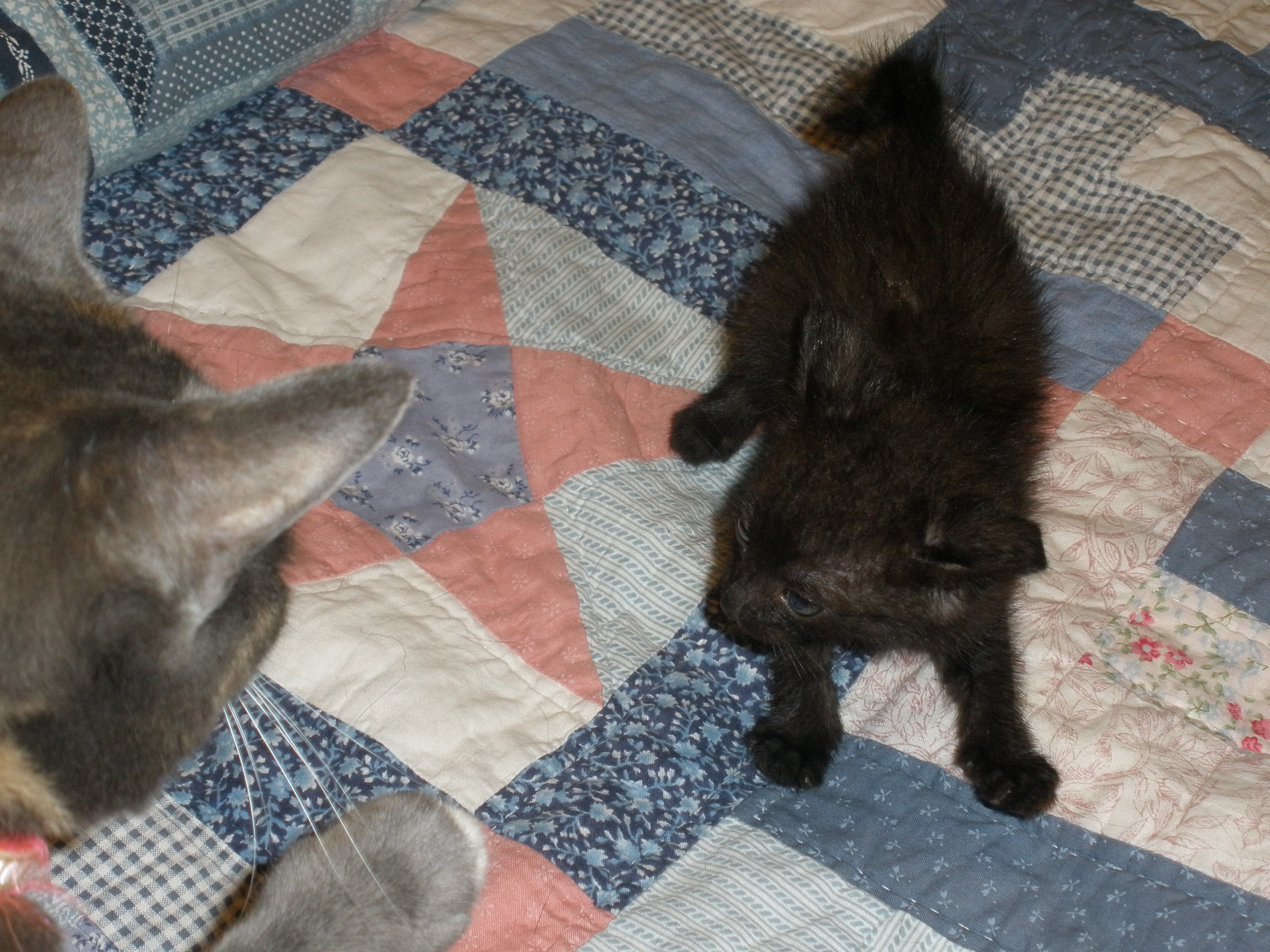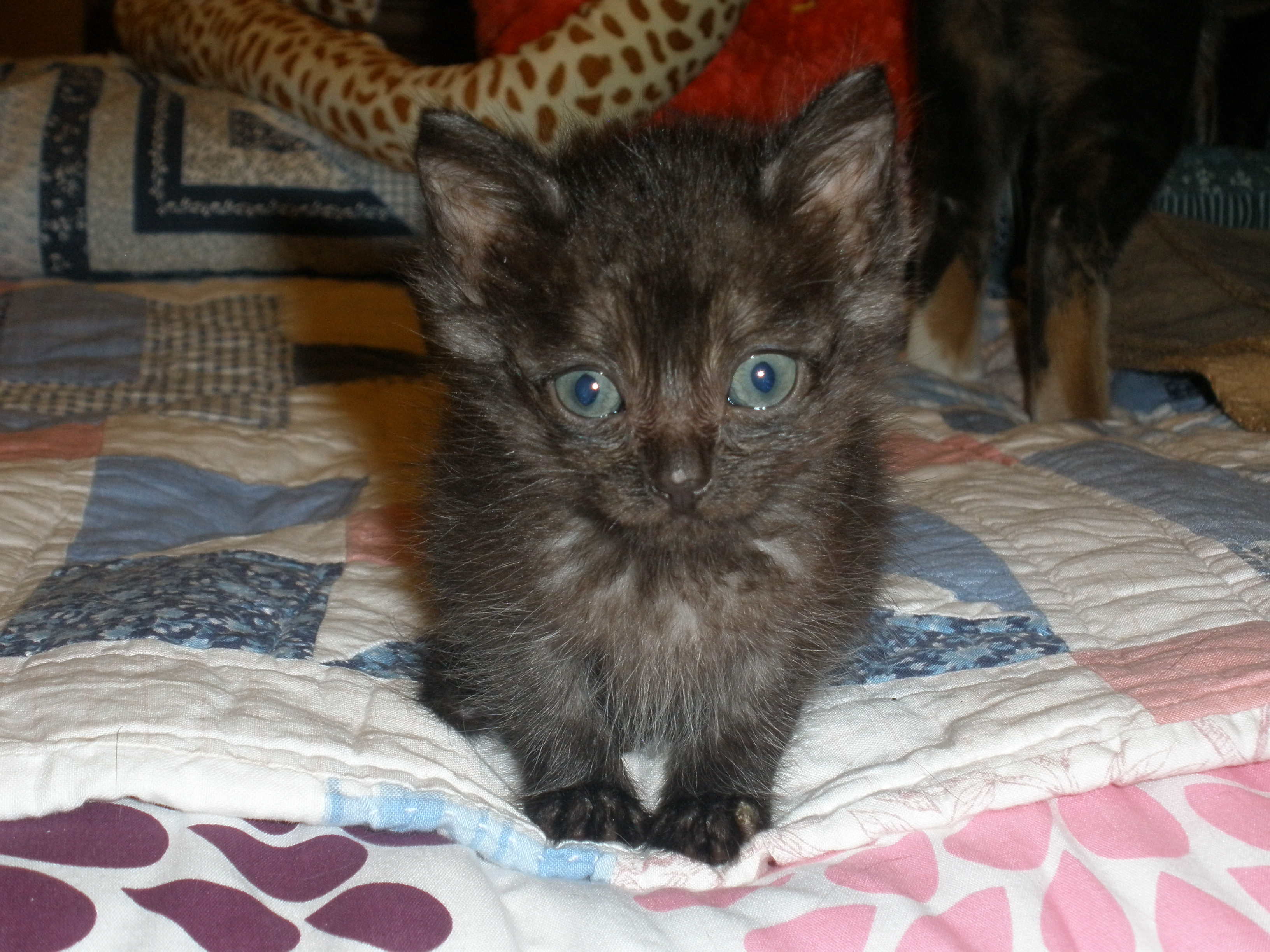 “Kitty” is just “Kitty.” She carries on conversations with anyone who will make eye contact with her. She loves to eat, sleep, and purr. She will not argue with a generous dose of snuggling and enjoys a good bit of kitten play with her brother. The twins are very close to each other, and it’s little wonder, since they survived together.
