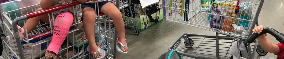 We had made it through the check out and were headed to the exit with receipt in hand when Little Miss Pink Cast decided it was time to stand up in the cart. In the process, her cast got stuck. So there we were – in the middle of the lane – trying to maneuver her immobile foot while she got madder and madder. I finally got her seated again but by this time she was very upset. She decided to vent loudly and viciously whacked the cart, something that did not make her feel any better. I chose to not take a quick survey of the audience I knew we had.